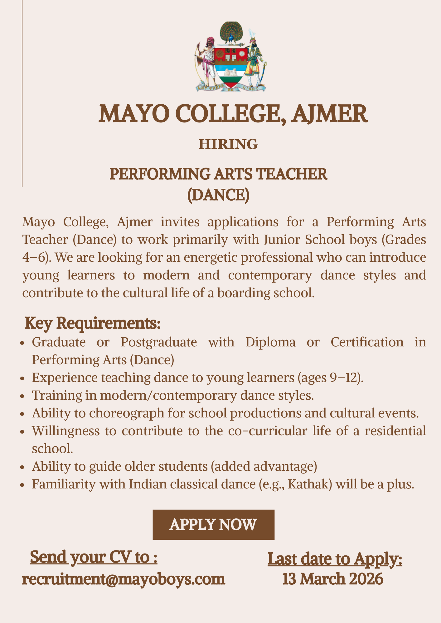 Mayo College, Ajmer invites applications for a Performing Arts Teacher (Dance) to work primarily with Junior School boys (Grades 4–6). We are looking for an energetic professional who can introduce young learners to modern and contemporary dance styles and contribute to the cultural life of a boarding school.